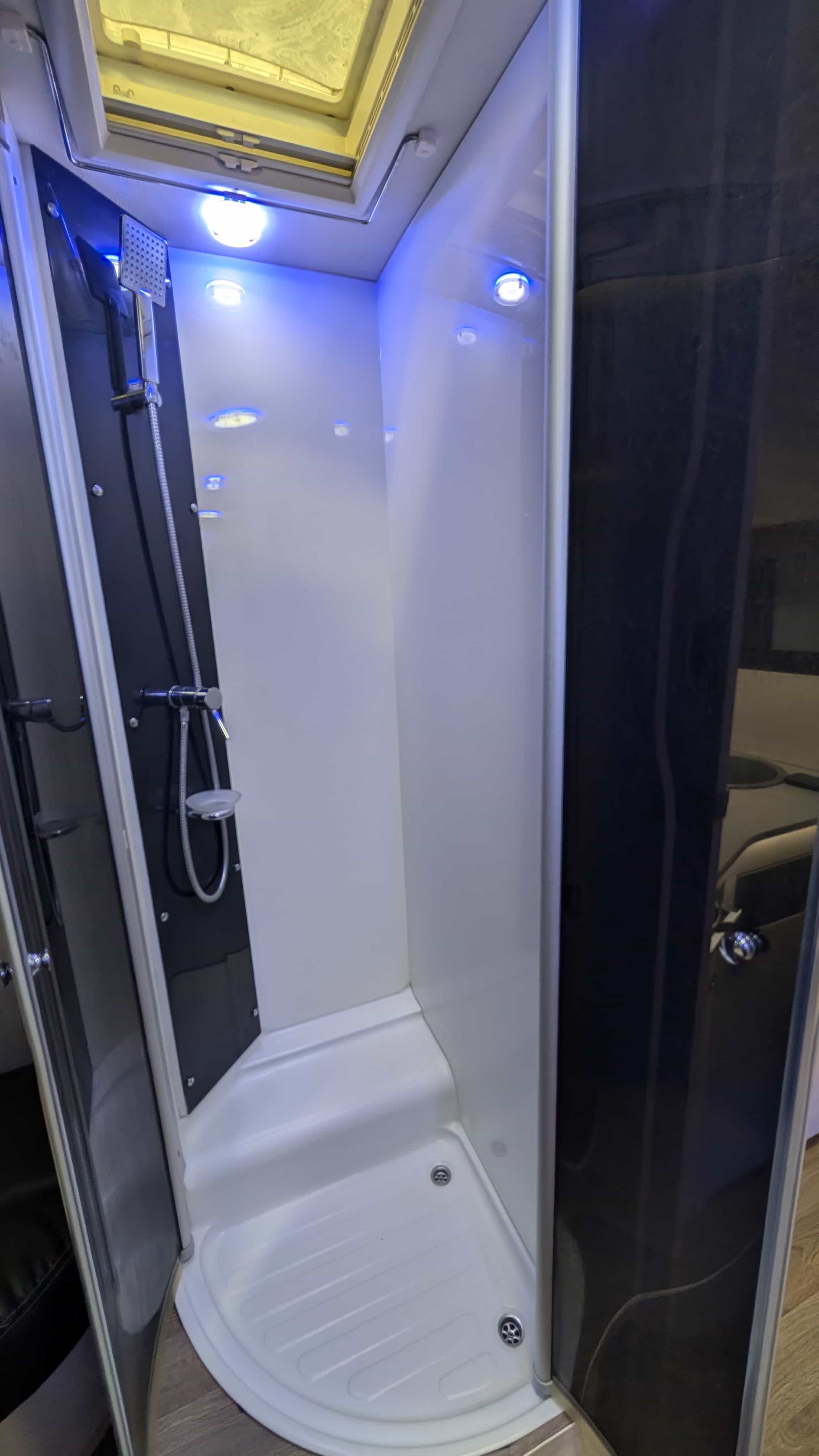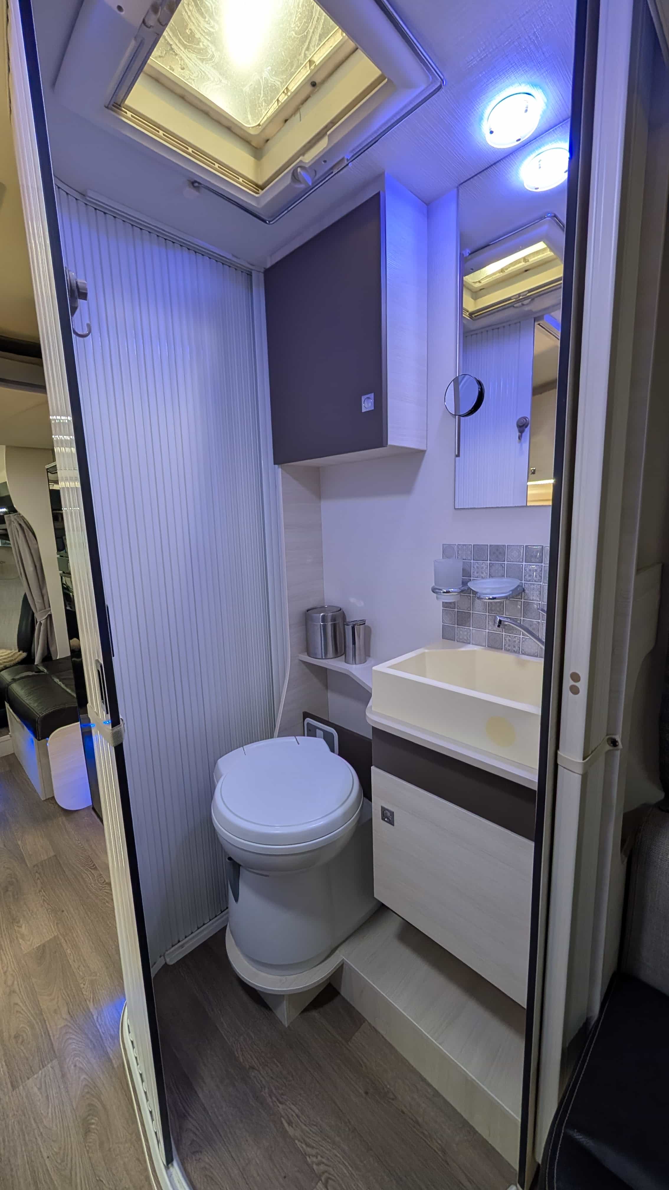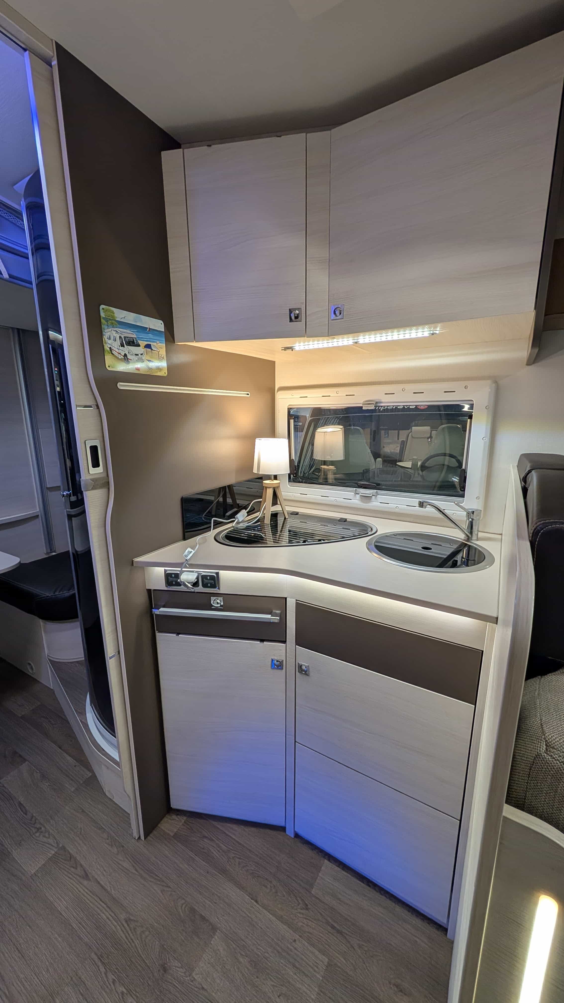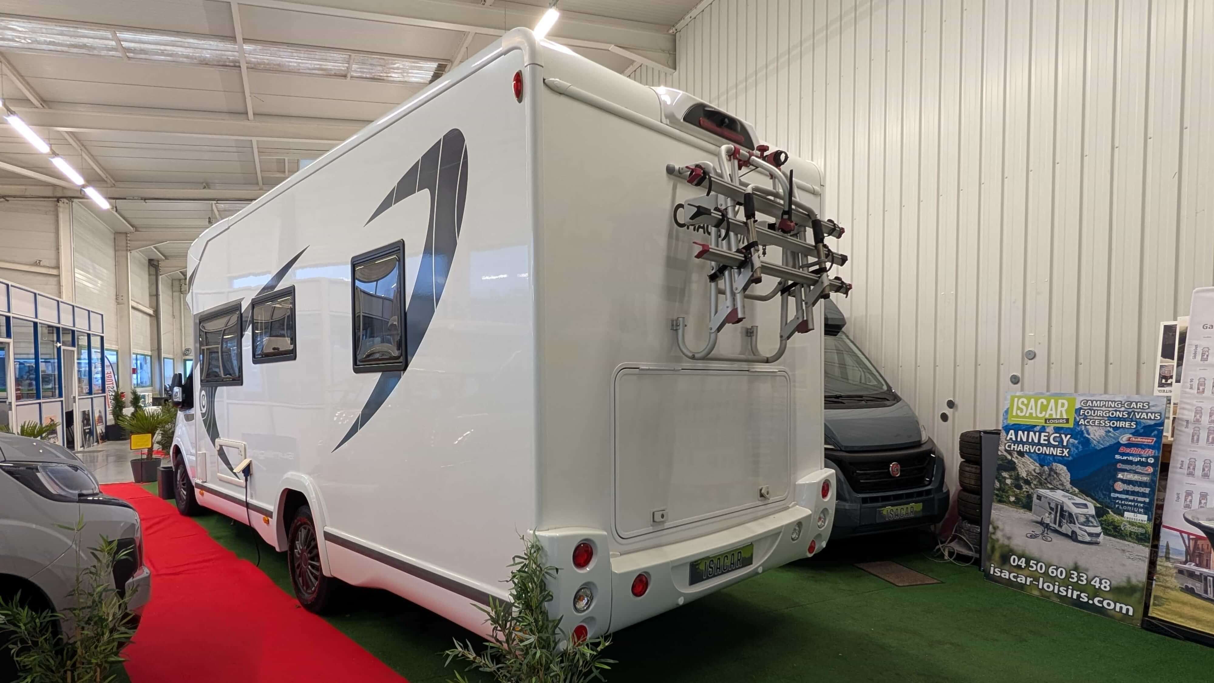 La généreuse prestation nuit du 716 a le bon goût de ne pas (trop) empiéter sur les autres postes, qu’il s’agisse du salon, classique, mais bien dimensionné, ou du cabinet de toilette, fidèle au principe de la douche indépendante. Seule la cuisine a dû renoncer à une disposition en L et modérer ses ambitions en termes de surface. Pour autant, l’équipement est au rendez-vous (réfrigérateur 175 l) et les rangements ne manquent pas. C’est pourtant à ce chapitre que le 716 peut être pris en défaut. Car son aménagement intérieur ne favorise pas l’installation de placards de pavillon. Le constructeur y pallie grâce aux coffres sous banquettes (avant et arrière) et surtout par la vaste soute-garage que surmonte un volumineux dressing. De fait, si les volumes sont au rendez-vous, leur facilité d’emploi et d’accès laisse à désirer. Pour autant, la soute est proportionnée pour accueillir un ou plusieurs deux-roues, motorisés ou non et ses deux portillons lui garantissent une réelle facilité d’utilisation.