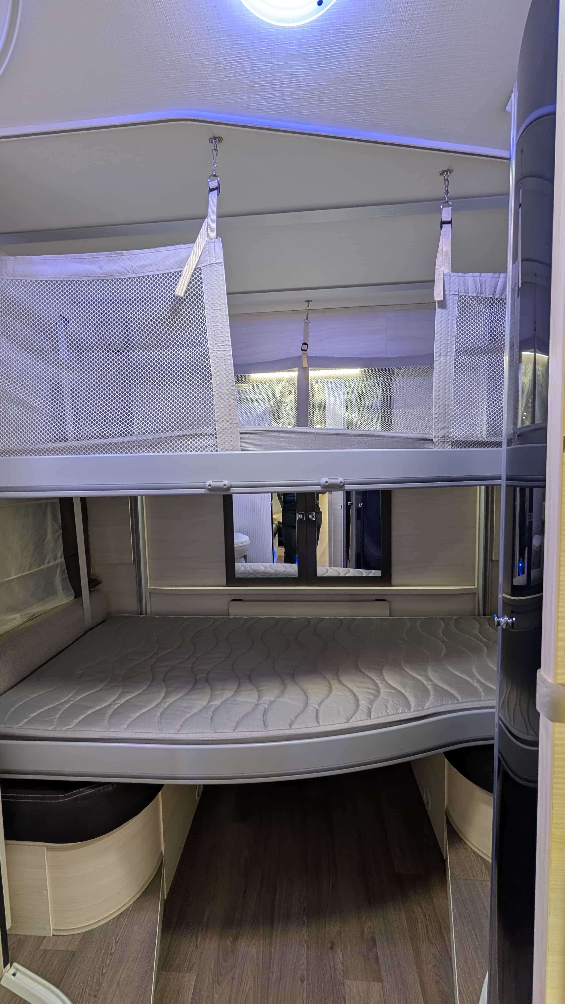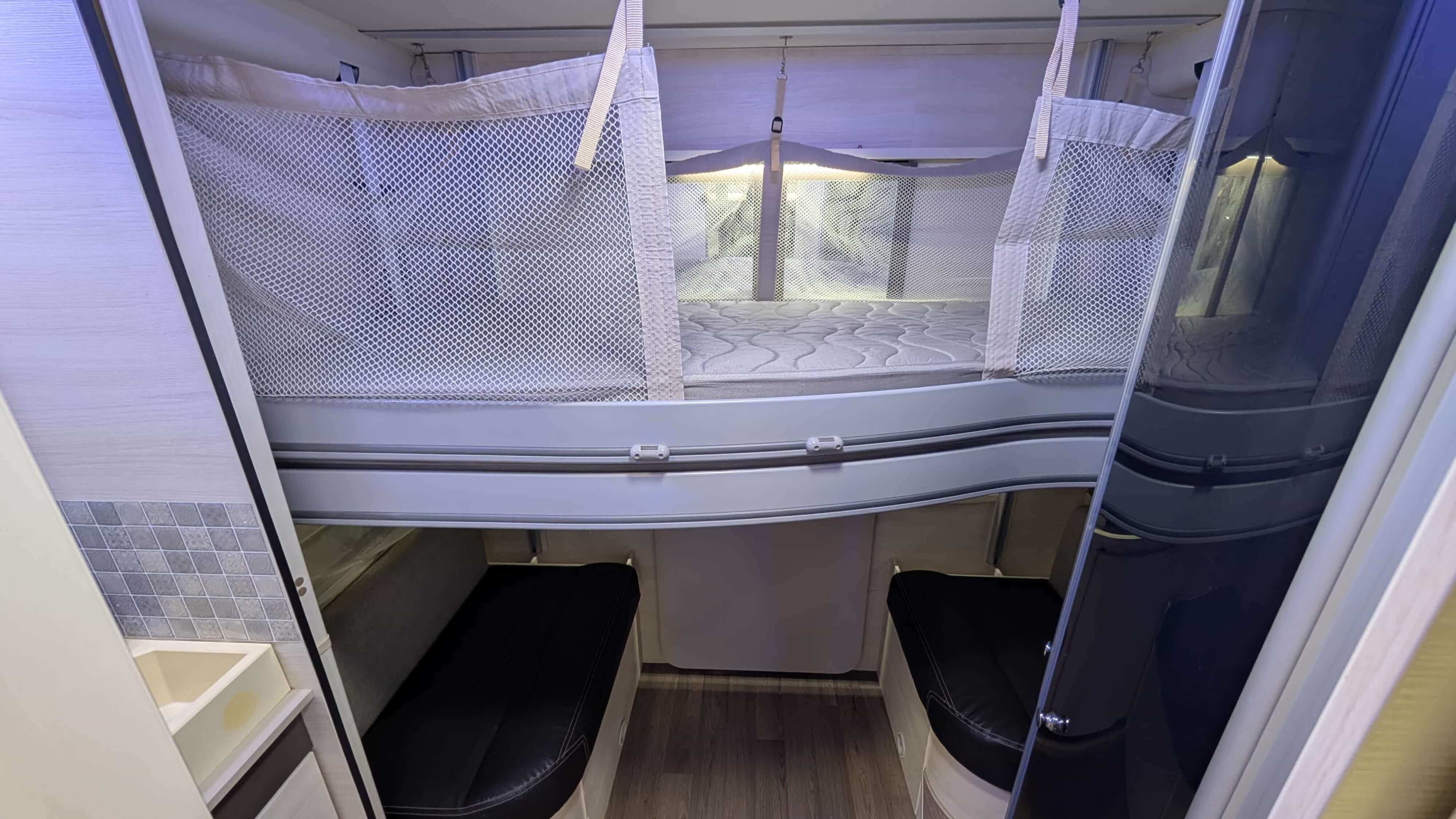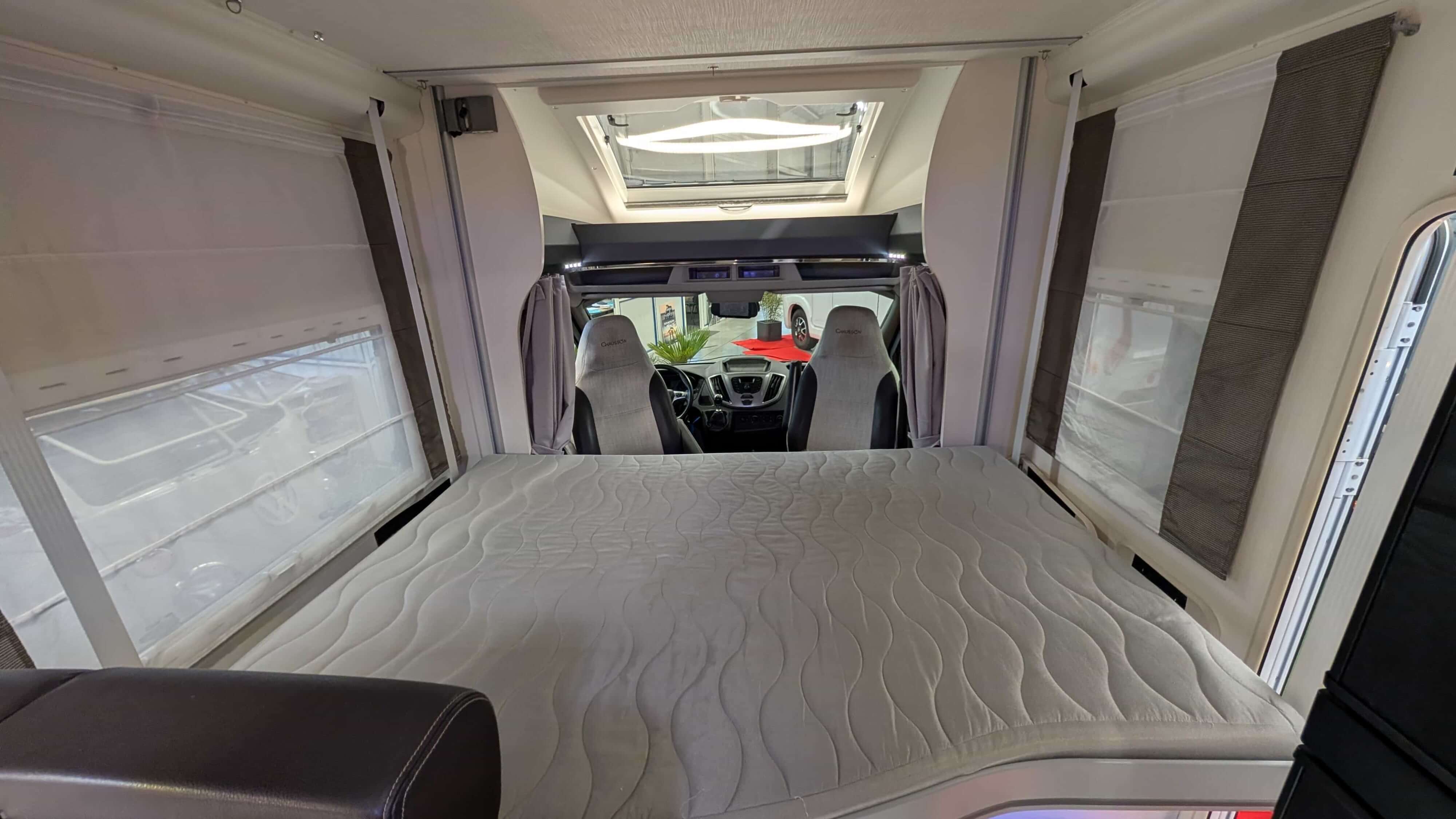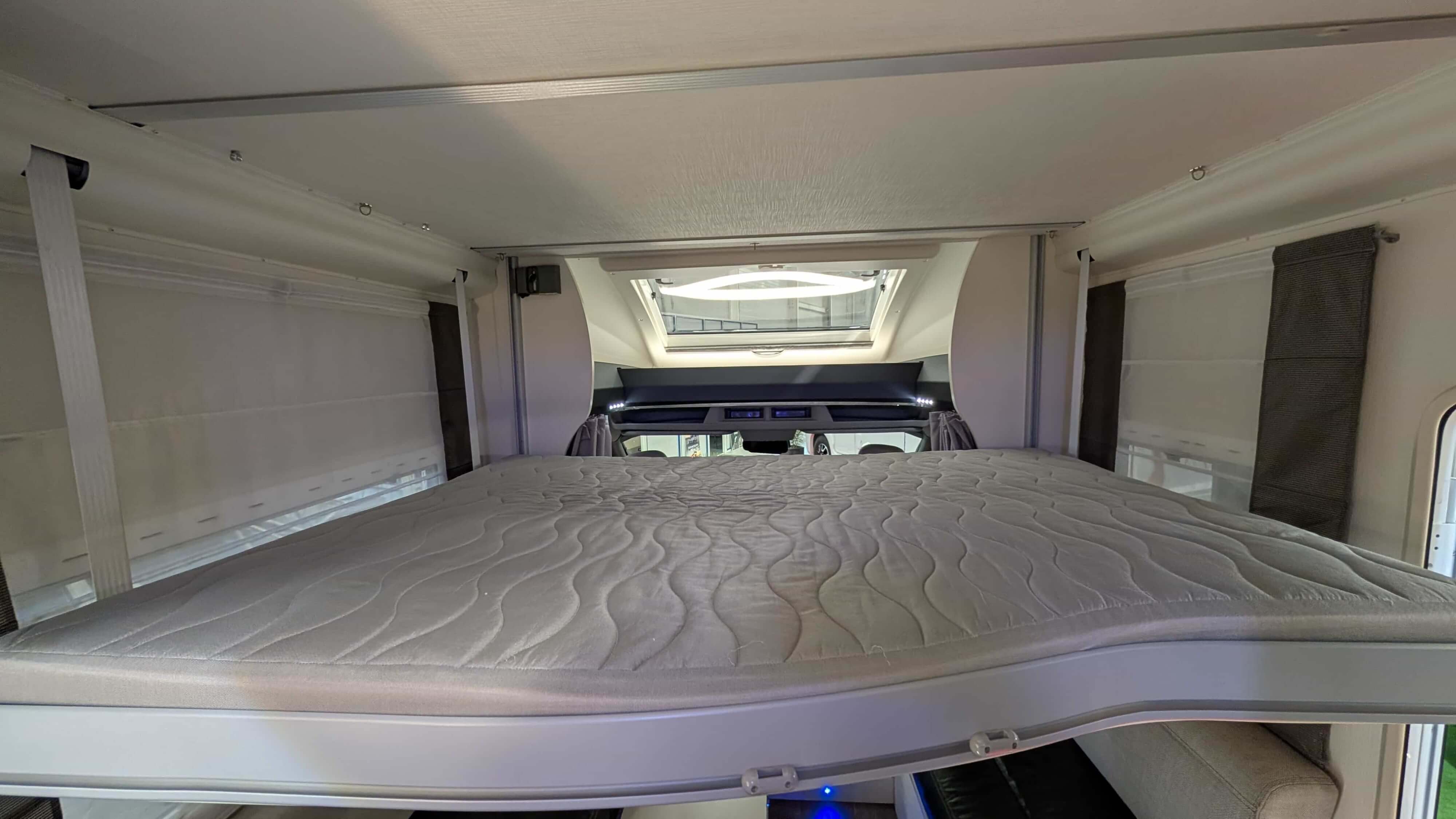 Le concept (breveté) DuoBed: des lits superposés qui se plaquent au plafond quand ils sont inutilisés, permettant de profiter tout au long de la journée d’une sympathique dînette deux places avec table escamotable. À l’heure du coucher, le mécanisme électrique (dont la commande est située au niveau de la cuisine) assure la mise en place d’un ou deux couchages selon les besoins. Le sommier inférieur prend appui sur les coussins de banquettes dont il n’est même pas besoin d’ôter les dossiers.