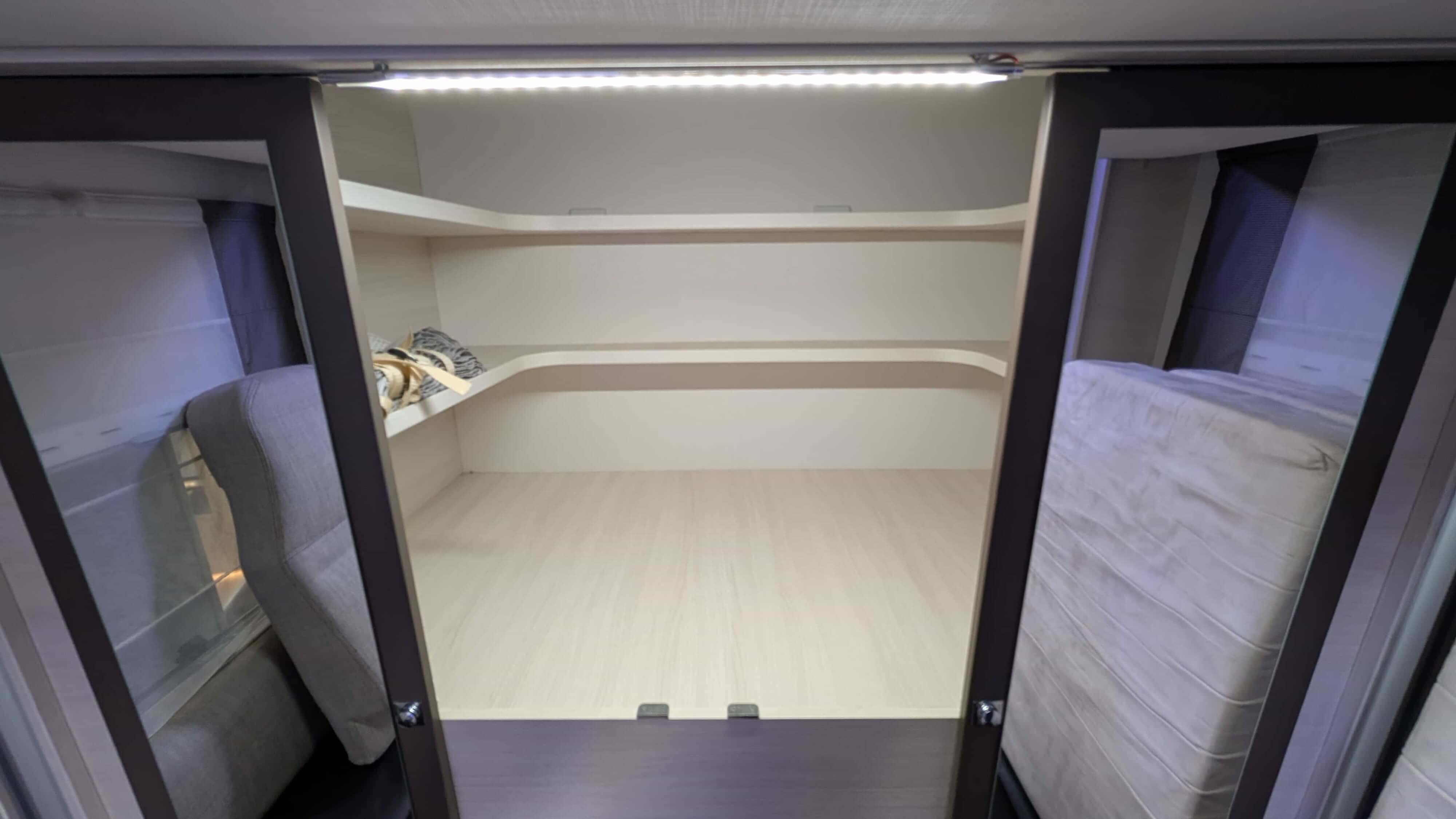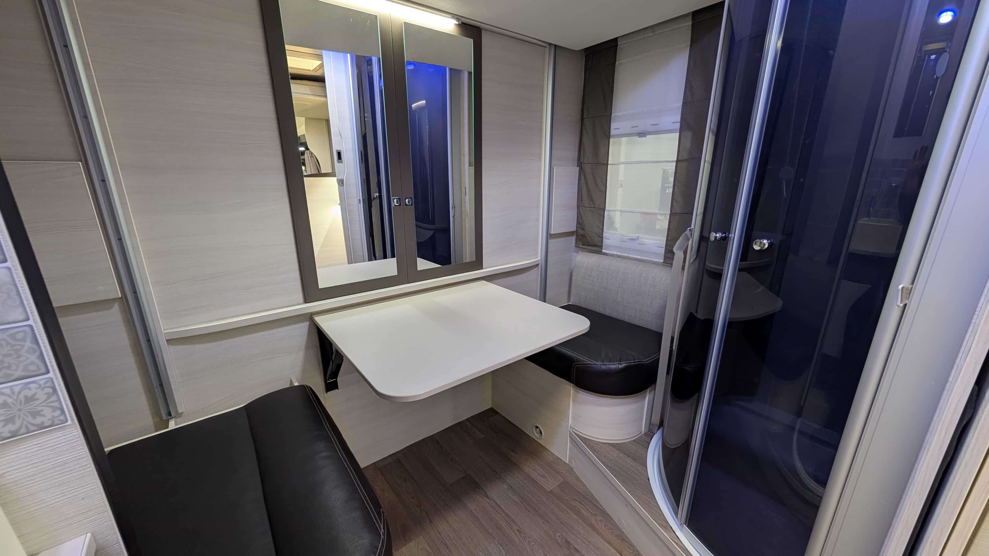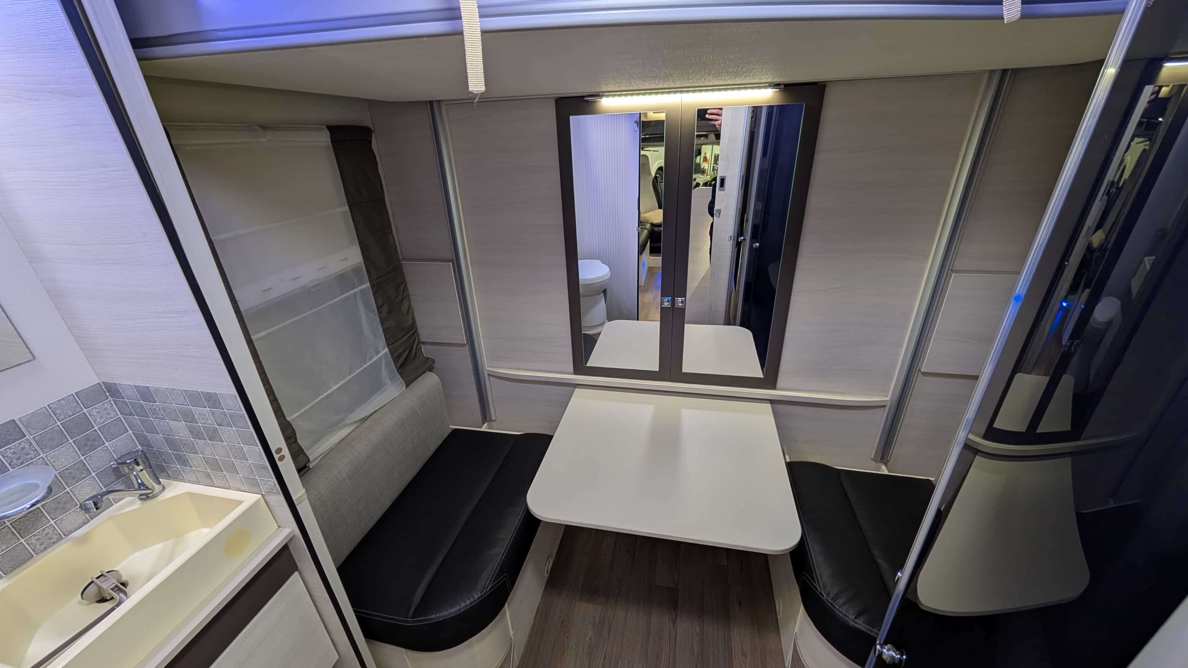 Plus classique, le couchage parental n’en est pas moins escamotable et bénéficie lui aussi d’une commande électrique. De taille standard malgré une largeur réduite en pied pour cause de frigo, il prend place au-dessus du salon dont la table aura été préalablement abaissée au niveau de l’assise des banquettes (encore un système électrique) si l’on veut utiliser le lit d’appoint, lequel apparaît d’ailleurs plus crédible que la moyenne du genre, dans le cadre d’un usage occasionnel, évidemment.