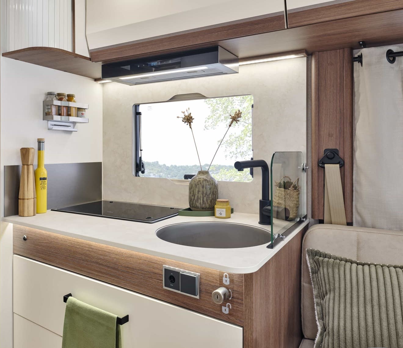 - Cuisine spacieuse avec grands tiroirs à fermeture douce et réfrigérateur à compression 150 L (dont 17 L congélateur)