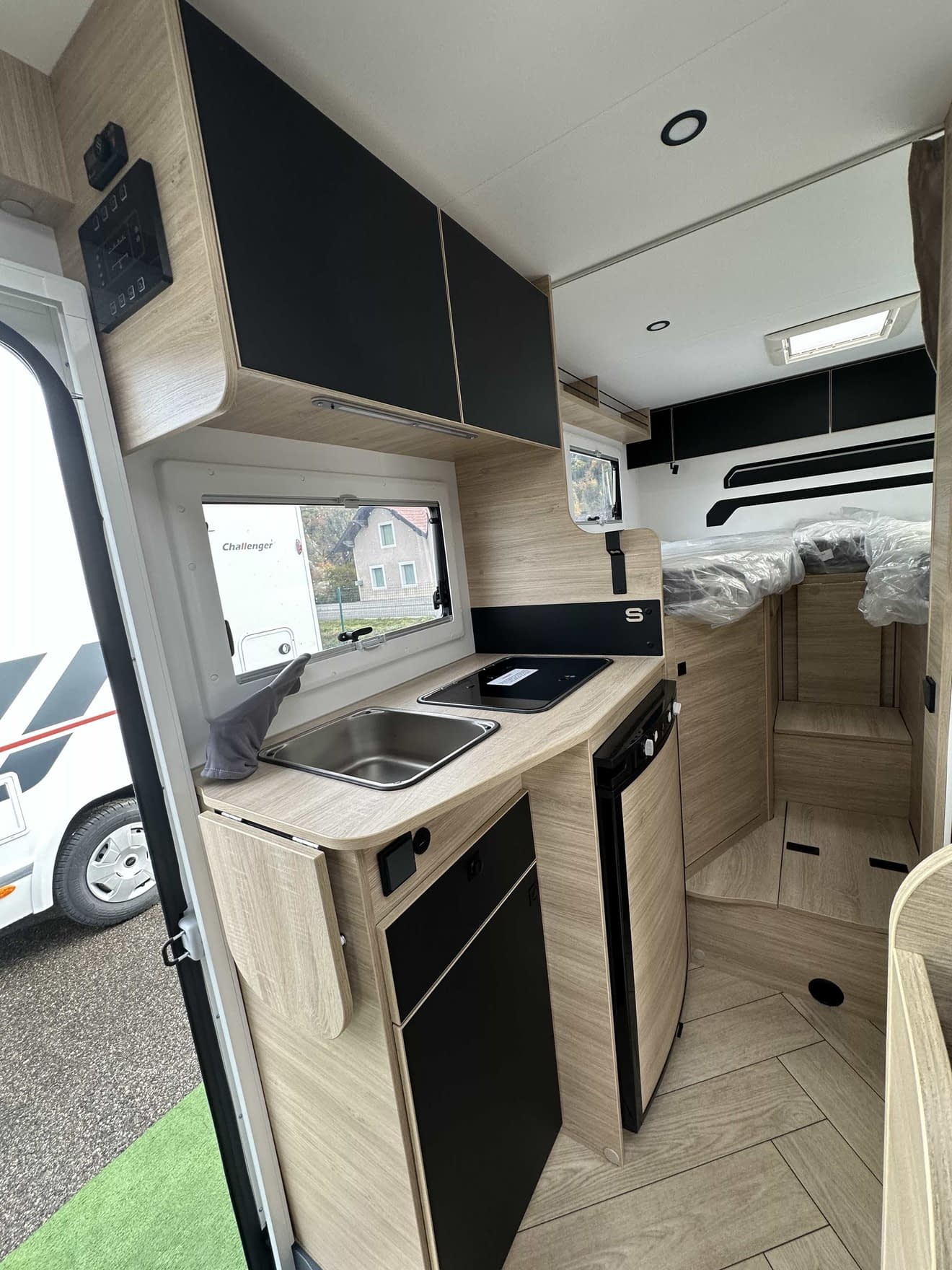 Le camping-car Van Challenger S217 Sport Edition, est un profilé ultra compact avec lits jumeaux sur soute garage. Il se distingue par une largeur réduite à 2.10m et 6m de long.