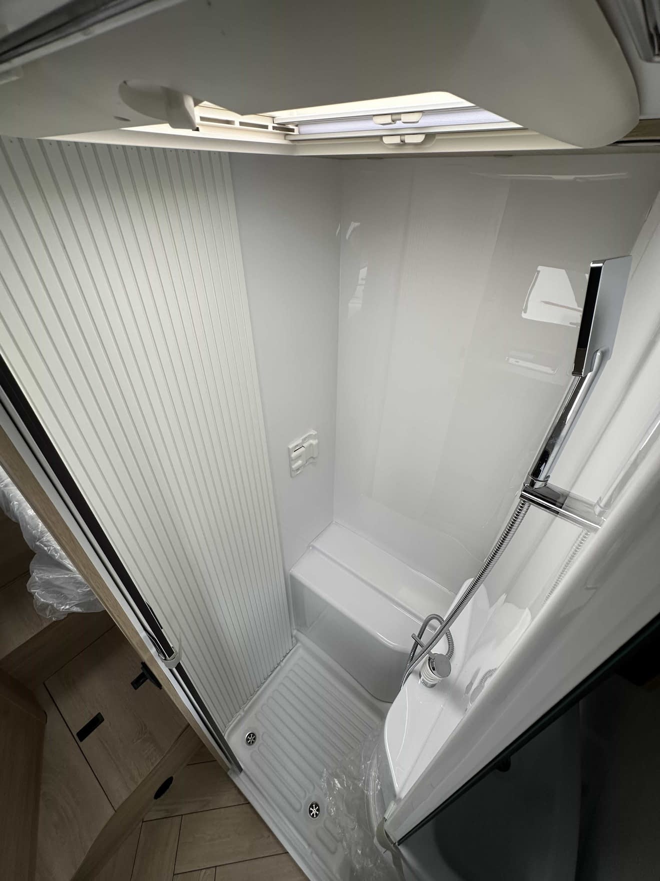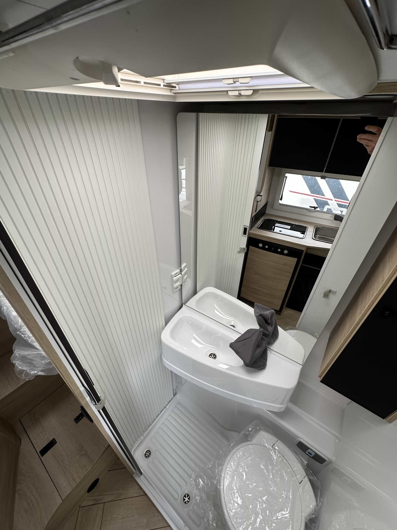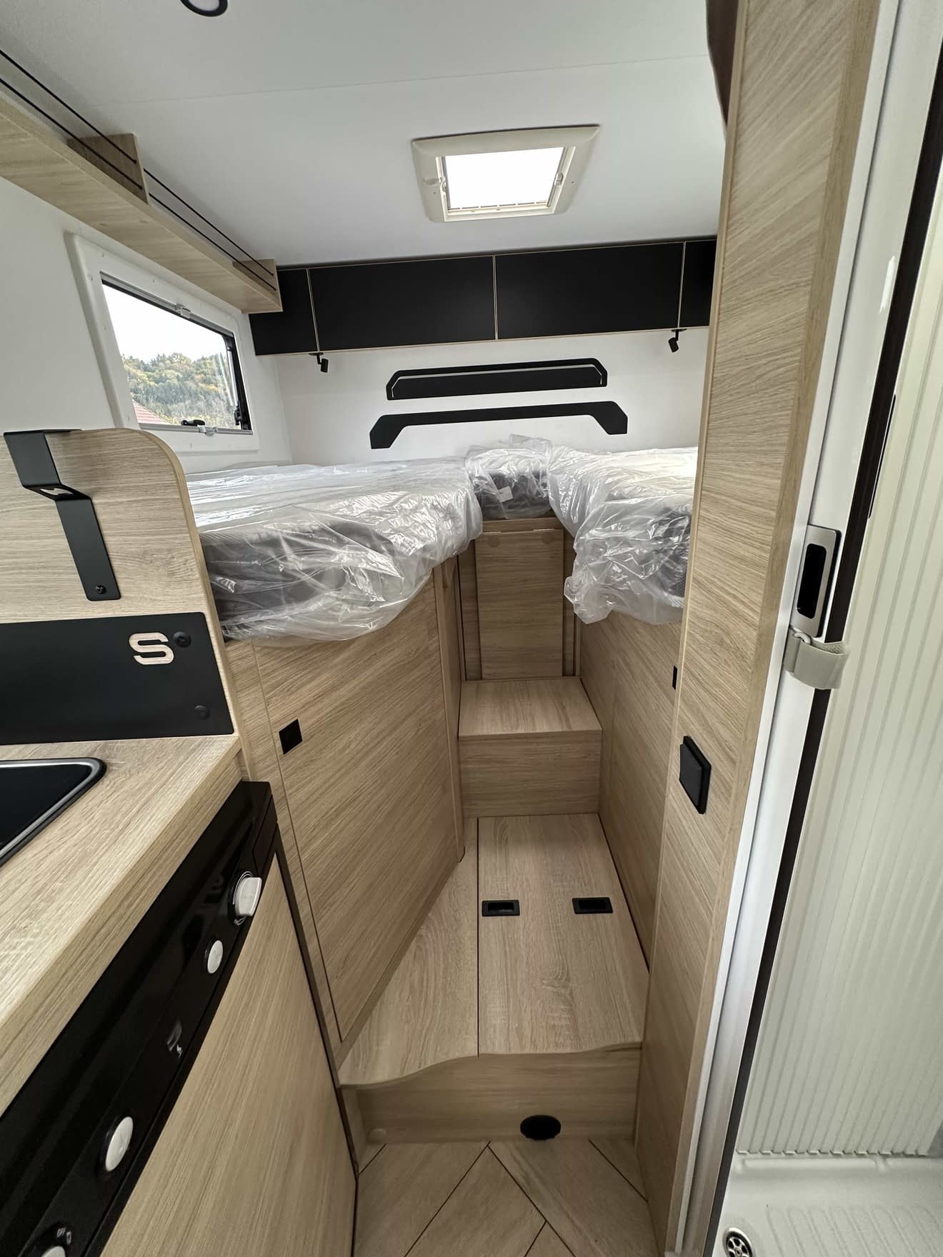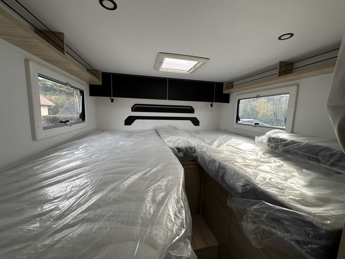Son implantation offre deux lits jumeaux sur grande soute garage, une salle de bain avec douche et toilettes, et un bloc cuisine avec un grand plan de travail.